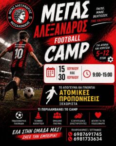 Το καλοκαίρι παίζεται στον Μέγα Αλέξανδρο Θεσσαλονίκης! Ξεκινά το ΜΕΓΑΣ ΑΛΕΞΑΝΔΡΟΣ FOOTBALL CAMP για παιδιά 5-12 ετών! 15 Ιουνίου – 30 Ιουνίου 09:00 – 15:00 Ποδοσφαιρικά παιχνίδια Τεχνική κατάρτιση Ομαδικό πνεύμα Εξωγηπεδικές δραστηριότητες Αγάπη για το ποδόσφαιρο Το απόγευμα θα πραγματοποιούνται και ατομικές προπονήσεις ξεχωριστά. Παίξε, μάθε, βελτιώσου… γίνε καλύτερος! Πληροφορίες / Εγγραφές: 6987691745 6981733634